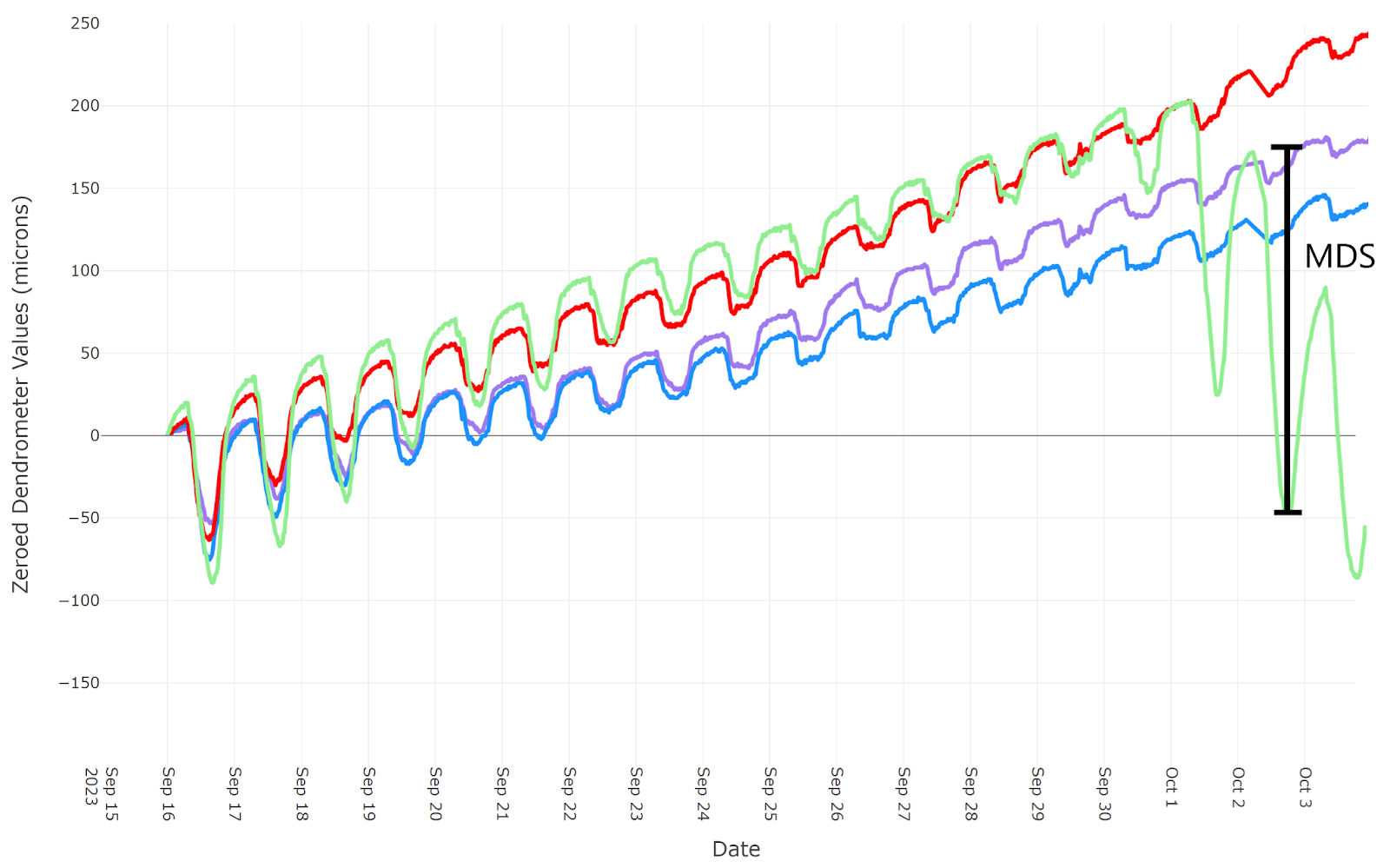 TWD is short for ‘Tree Water Deficit.’ It is calculated similarly to MDS, and the contributors to changing TWD are similar to the contributors to changing MDS. The difference is that TWD is the difference between the current day’s minimum and the historical maximum. TWD and MDS would be identical if last night’s maximum was the historical maximum. Such, the TWD and MDS will generally be the same when the tree is growing a small amount each night. The utility in using the TWD metric is that it considers the accumulated effects of many days of stress. If the tree is not recovering each night (negative growth), the MDS might be steady or even decrease with greater stress, but the TWD will increase. This makes the TWD metric more useful than MDS over many extended days of stress. Many days of negative Growth, coupled with increasing TWD, could be cause for concern. This type of pattern is common when a tree suddenly stops receiving irrigation, say from a faulty valve or clogged/broken emitter.