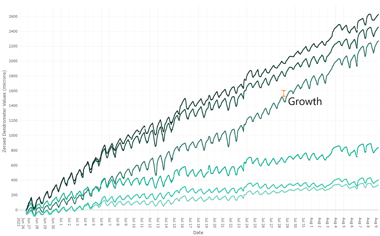 This is the daily change in the maximum dendrometer value. The maximum values typically occur around dawn, when the tree is under the least tension from transpiration. During the course of the day, and sometimes particularly at night, the tree will create new xylem or wood cells. This is considered an irreversible process, in that once created, the new wood is permanent. If a small amount of growth occurs each 24-hour period, it is manifested in a small increase in the dendrometer reading, each night before dawn, relative to the reading the previous night. Simply, the growth metric is a way to view the tree by ignoring the daily contractions. More growth generally means greater vigor. Growth can vary from tree to tree and even within different mount points on the same tree, and is most useful as a relative metric as it evolves over time within different groups of trees. For instance, growth might be less for a group of trees that are receiving less water than an otherwise identical group of trees.